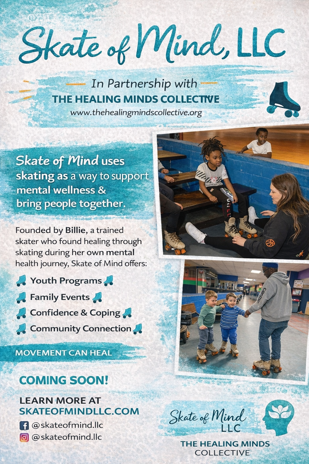 Skate of Mind is a therapeutic wellness program created through a partnership between Skate of Mind, LLC and The Healing Minds Collective. Designed for youth and families, this program uses skating as a meaningful way to support emotional wellness, reduce stress, build confidence, and strengthen community connection. Rooted in lived experience, movement, and encouragement, Skate of Mind creates a supportive space where participants can feel free to learn, grow, and enjoy the healing power of motion.