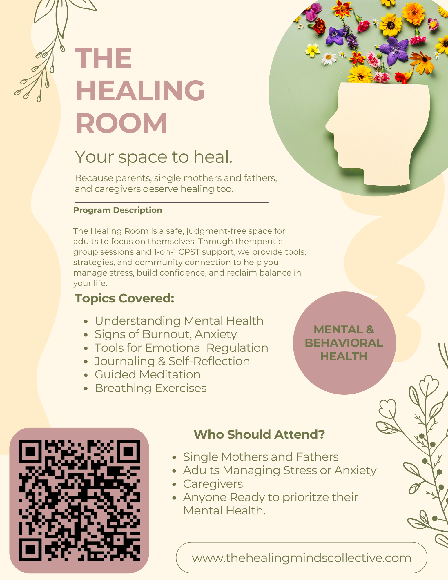 The Healing Room is a structured adult healing and growth program created specifically for parents and caregivers of youth enrolled in The Healing Minds Collective. This program provides a safe, judgment-free space for adults to focus on their own emotional wellness while learning practical tools to navigate everyday life.