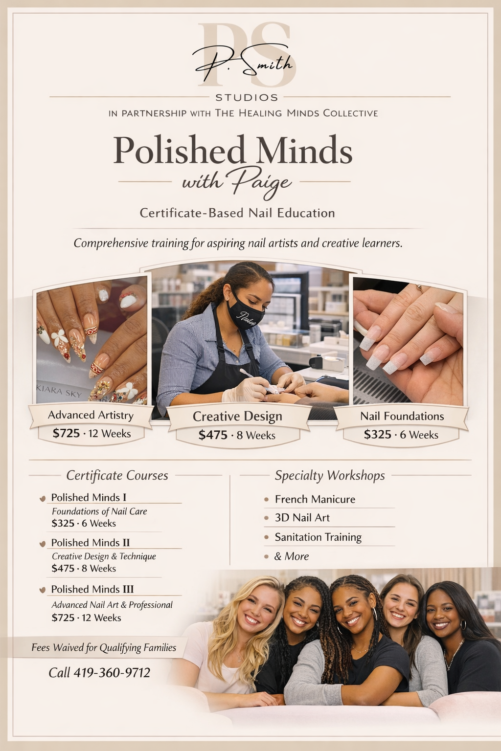 Polished Minds is a certificate-based nail education program designed to blend beauty, confidence, and creativity in one professional space. Created for beginners and aspiring nail artists, the program teaches hands-on nail skills, sanitation, and design techniques while encouraging self-expression, discipline, and personal growth. At The Healing Minds Collective, we believe mental health deserves to be normalized in real-life spaces, and Polished Minds was created to show that healing, learning, and beauty can all exist together beautifully.
